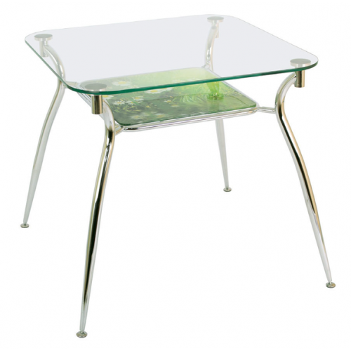 Стол обеденный А-611 имеет стеклянную столешницу 800*800 мм. Высота стола 750 мм. Столешница - стекло 10 мм. Полка - стекло 6 мм. Крепление столешницы к стойкам стола выполнено по УФ-технологии. Крепление полки выполнено при помощи присосок. Стойки стола металлические, покрытие - хром.
