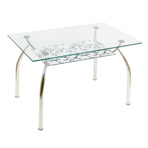 Стол обеденный А-615 имеет стеклянную столешницу 1200*700 мм. Высота стола 750 мм. Столешница - стекло 10 мм. Полка - стекло 6 мм. Крепление столешницы к стойкам стола выполнено по УФ-технологии. Крепление полки к стойкам стола выполнено при помощи винтов. Стойки стола металлические, покрытие - хром.