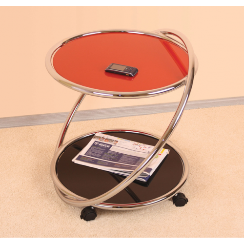 Стол журнальный С01 имеет стеклянную столешницу и полку - стекло 6 мм. Высота стола 570 мм. Дизайн выполнен методом покраски. Крепление столешницы и полки к каркасу стола с помощью присосок. Каркас стола металлический, покрытие - хром, имеет колесные опоры.