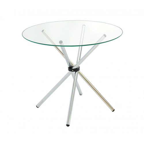 Стол обеденный Худро круг имеет стеклянную столешницу диаметром 900 мм. Высота стола 750 мм. Столешница - стекло 10 мм. Крепление столешницы к стойкам стола выполнено при помощи присосок. Стойки стола металлические, покрытие - хром.