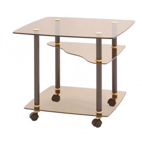 Стол журнальный Квадрат имеет стеклянную столешницу 600*600 мм. Высота стола 540 мм. Столешница - стекло 8 мм. Полки - стекло 6 мм. Стойки стола металлические c декоративным покрытием имеют колесные опоры.