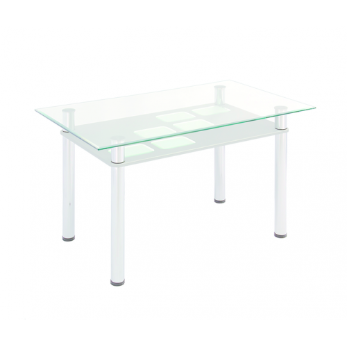 Стол обеденный 3.0 имеет стеклянную столешницу 1200*700 мм. Высота стола 720 мм. Столешница - стекло 10 мм. Обработка кромки - фацет. Полка - МДФ со стеклянными вставками. Крепление столешницы выполнено по УФ-технологии. Стойки стола металлические, труба диаметром 60 мм, покрытие - хром.