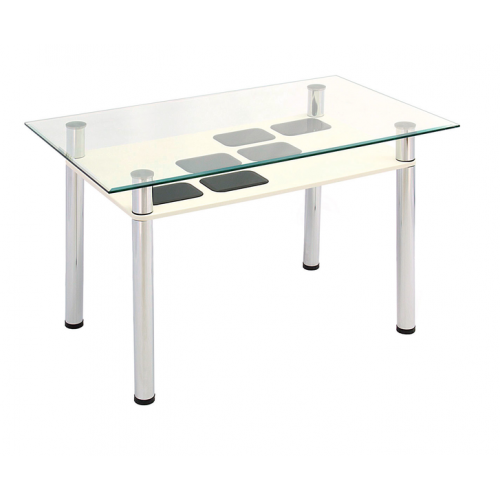 Стол обеденный 3.0 имеет стеклянную столешницу 1200*700 мм. Высота стола 720 мм. Столешница - стекло 10 мм. Обработка кромки - фацет. Полка - МДФ со стеклянными вставками. Крепление столешницы выполнено по УФ-технологии. Стойки стола металлические, труба диаметром 60 мм, покрытие - хром.