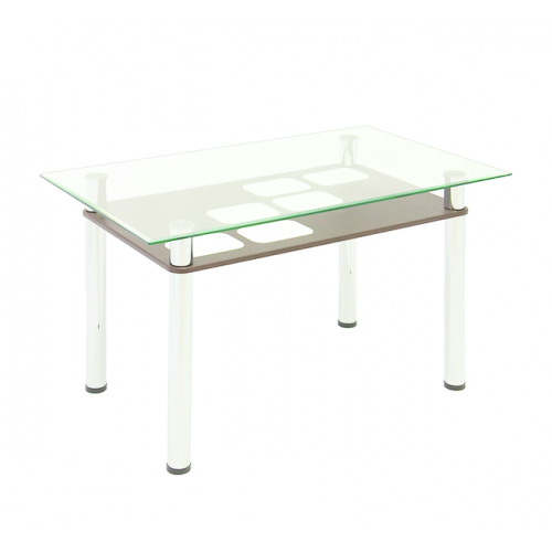 Стол обеденный 3.0 имеет стеклянную столешницу 1200*700 мм. Высота стола 720 мм. Столешница - стекло 10 мм. Обработка кромки - фацет. Полка - МДФ со стеклянными вставками. Крепление столешницы выполнено по УФ-технологии. Стойки стола металлические, труба диаметром 60 мм, покрытие - хром.