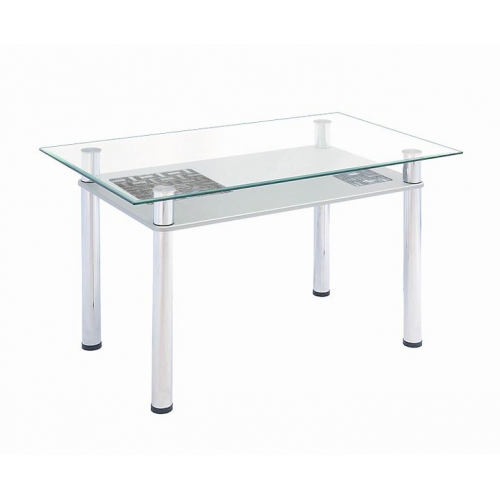 Стол обеденный 3.1 имеет стеклянную столешницу 1200*700 мм. Высота стола 720 мм. Столешница - стекло 10 мм. Обработка кромки - фацет. Полка - МДФ со стеклянными вставками. Крепление столешницы выполнено по УФ-технологии. Стойки стола металлические, труба диаметром 60 мм, покрытие - хром.