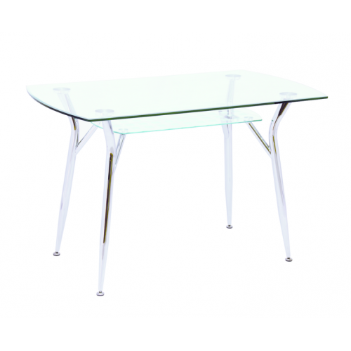Стол обеденный А-604Ф имеет стеклянную столешницу 1200*700 мм. Высота стола 770 мм. Столешница - стекло 10 мм. Обработка кромки - фацет. Полка - стекло 6 мм. Крепление столешницы и полки к стойкам стола выполнено по УФ-технологии. Стойки стола металлические, покрытие - хром.