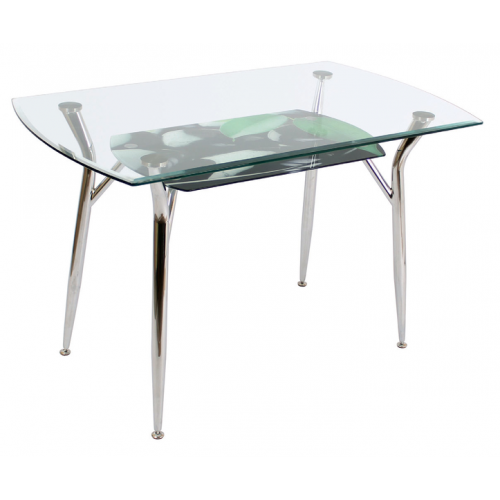 Стол обеденный А-604Ф имеет стеклянную столешницу 1200*700 мм. Высота стола 770 мм. Столешница - стекло 10 мм. Обработка кромки - фацет. Полка - стекло 6 мм. Крепление столешницы и полки к стойкам стола выполнено по УФ-технологии. Стойки стола металлические, покрытие - хром.