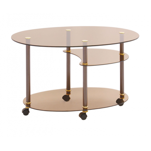 Стол журнальный Полуовал имеет стеклянную столешницу 890*590 мм. Высота стола 540 мм. Столешница - стекло 8 мм. Полки - стекло 6 мм. Стойки стола металлические c декоративным покрытием имеют колесные опоры.