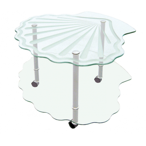 Стол журнальный Ракушка имеет стеклянную столешницу 832*695 мм. Высота стола 520 мм. Столешница - стекло 8 мм. Полка - стекло 6 мм. Дизайн выполнен методом гравировки. Стойки стола металлические c декоративным покрытием имеют колесные опоры.