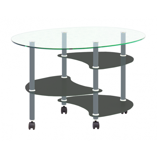 Стол журнальный Рио имеет стеклянную столешницу 890*590 мм. Высота стола 540 мм. Столешница - стекло 8 мм. Полки - стекло 6 мм. Стойки стола металлические c декоративным покрытием имеют колесные опоры.