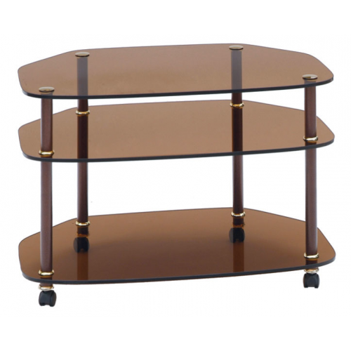 Подставка под аппаратуру ТV-3 имеет стеклянную столешницу 750*460 мм. Высота стола 540 мм. Столешница и полки - стекло 8 мм. Стойки стола металлические c декоративным покрытием имеют колесные опоры.