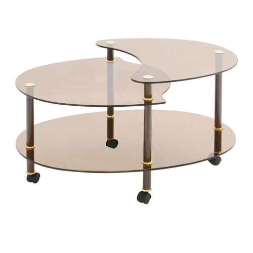 Стол журнальный Тюльпан имеет стеклянную столешницу и полки. Высота стола 520 мм. Столешница - стекло 8 мм. Полки - стекло 8 мм. Стойки стола металлические c декоративным покрытием имеют колесные опоры.