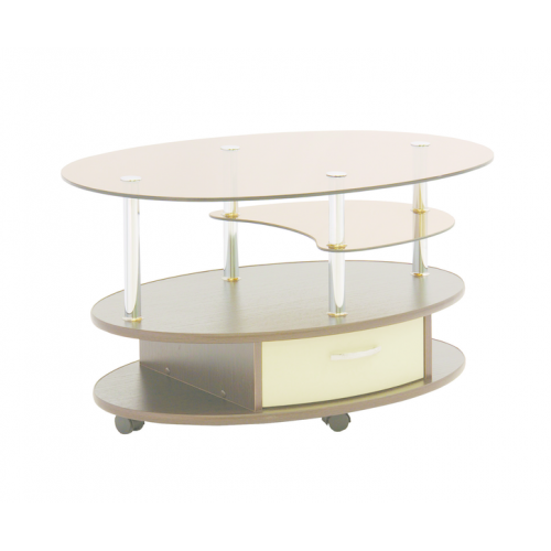 Cтол журнальный Варьете 1 имеет стеклянную столешницу 890*590 мм. Высота стола 490 мм. Столешница - стекло 8 мм., Полка - стекло 6 мм. Подстолье изготовлено из МДФ, имеет выдвижной ящик и колесные опоры. Стойки стола металлические, покрытие - хром.